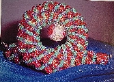 | 「クリスマスリース ’03」 高さ50mm <作品の解説> この作品は、テーブルに置くクリスマス&お正月おリースです。 リースの中には、パールビーズが入っていて上品な装いです。 また、リースの中心にもパールにビーズをあしらって アクセントになっています。オーガンジーのクッションの上に 置いて飾ってください。