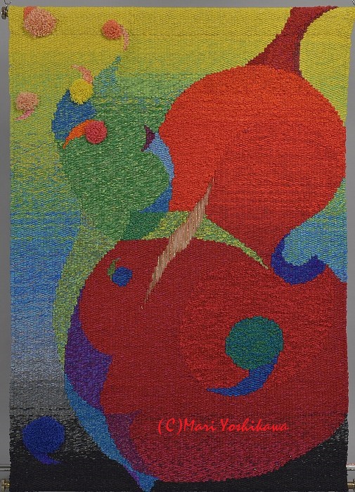 | 2015年 赤いチェロ 技法:綴れ織りタペストリー 素材:ウールと絹 180cm×125cm |